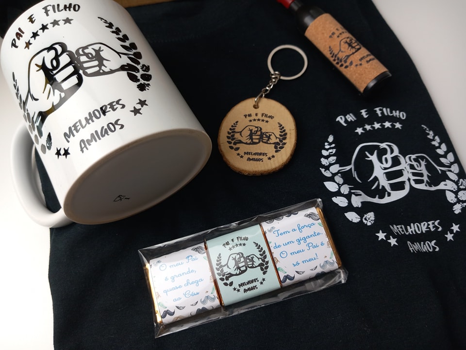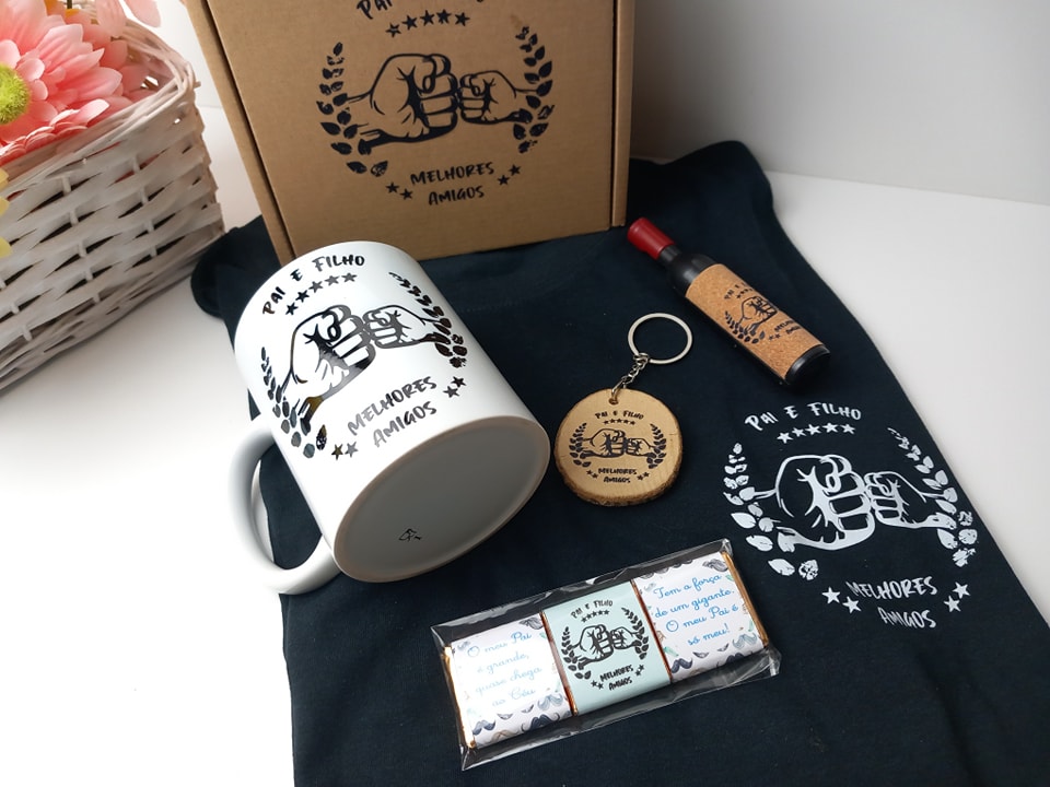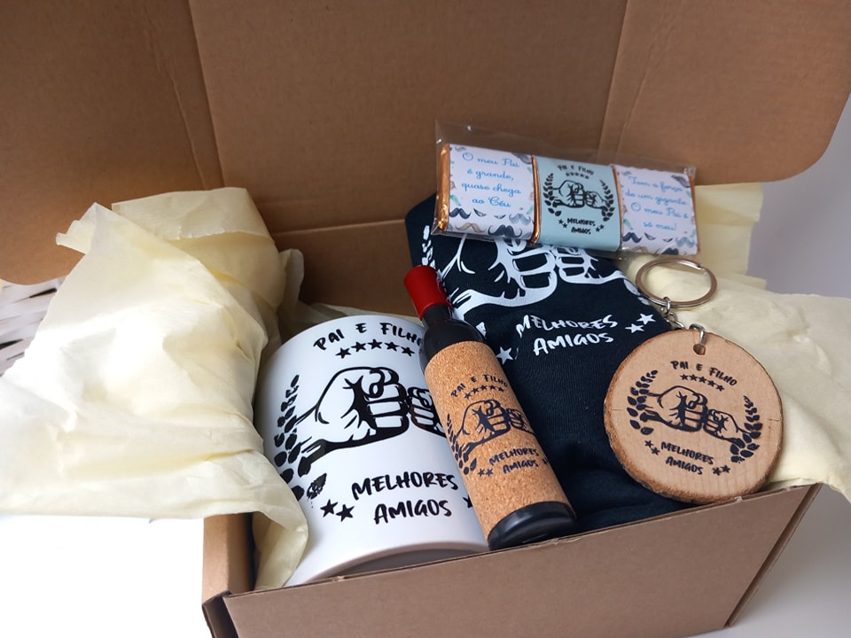 Box composta por t-shirt (branca ou preta), porta chaves tronco de madeira, saca rolhas personalizado com cortiça, caneca e conjunto de 3 napolitanas gulosas