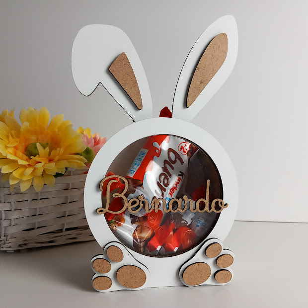 Caixa em mdf, com formato de Ovo e orelhas e patas de coelho