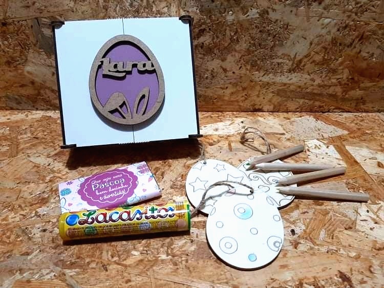 Recheada com 3 ovos em madeira para pintar, 4 lápis de cor, chocolate de 20gr personalizado, tubo de drageias de chocolate