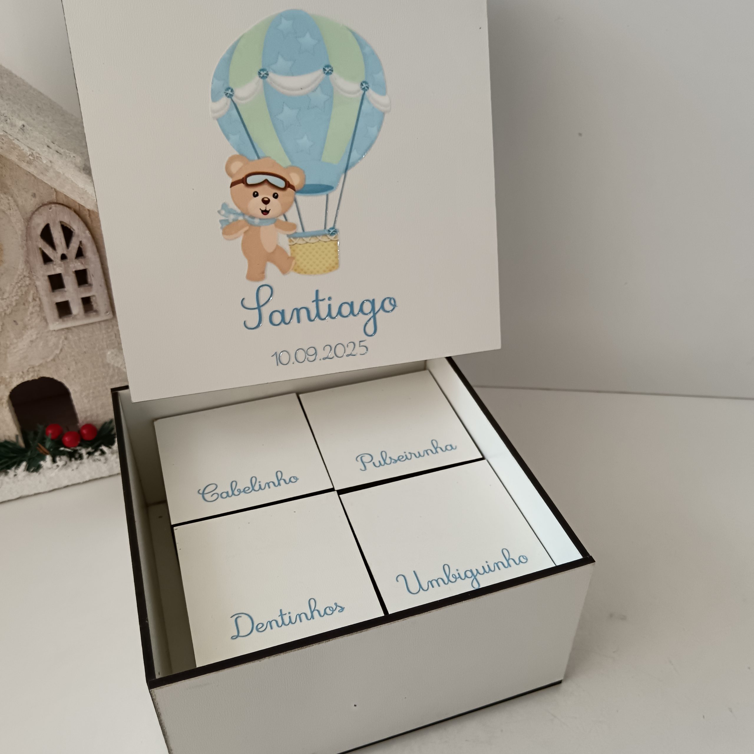 Caixa em madeira, com 4 caixinhas para guardar recordações do bebé (pulseirinha, cabelinho, umbiguinho, dentinhos)