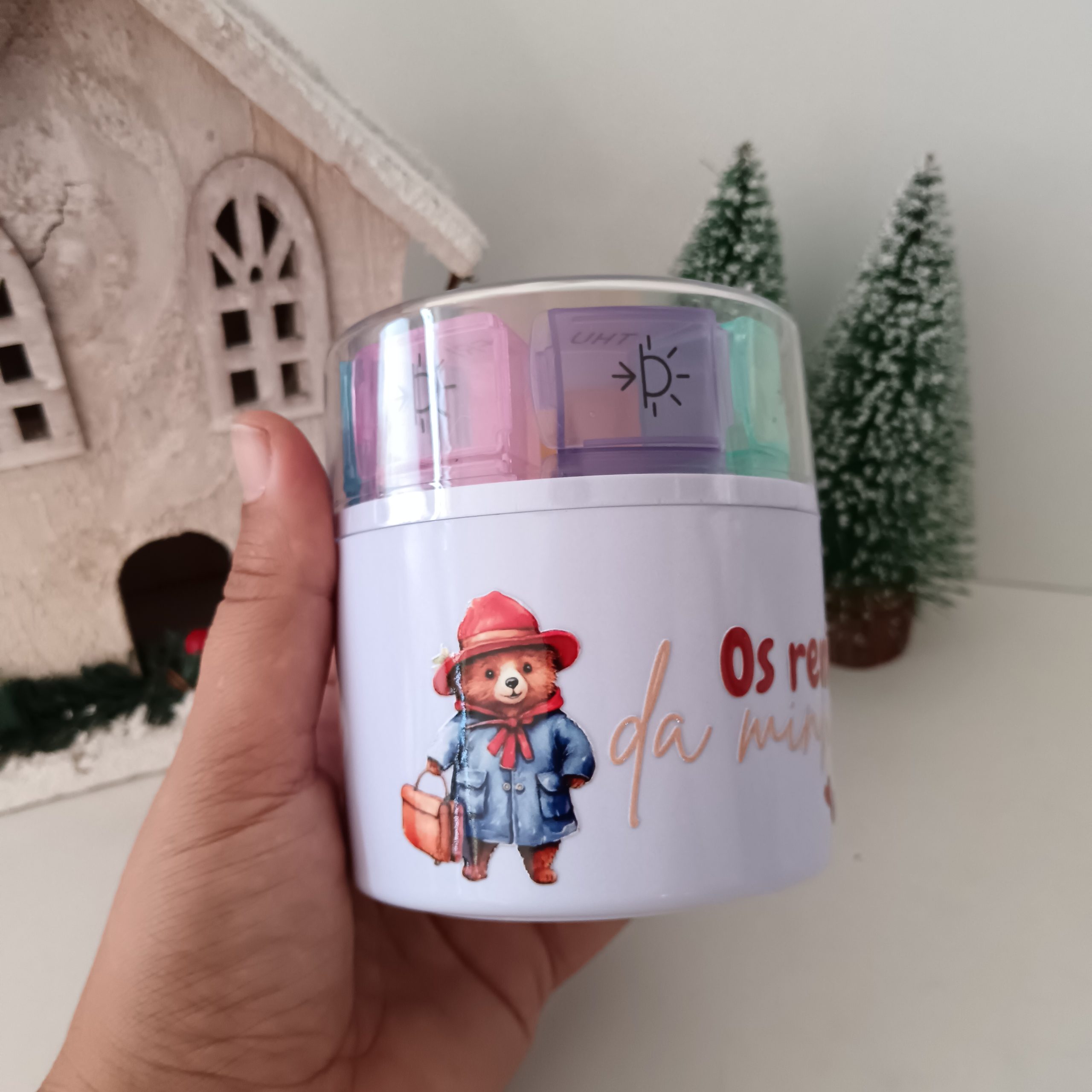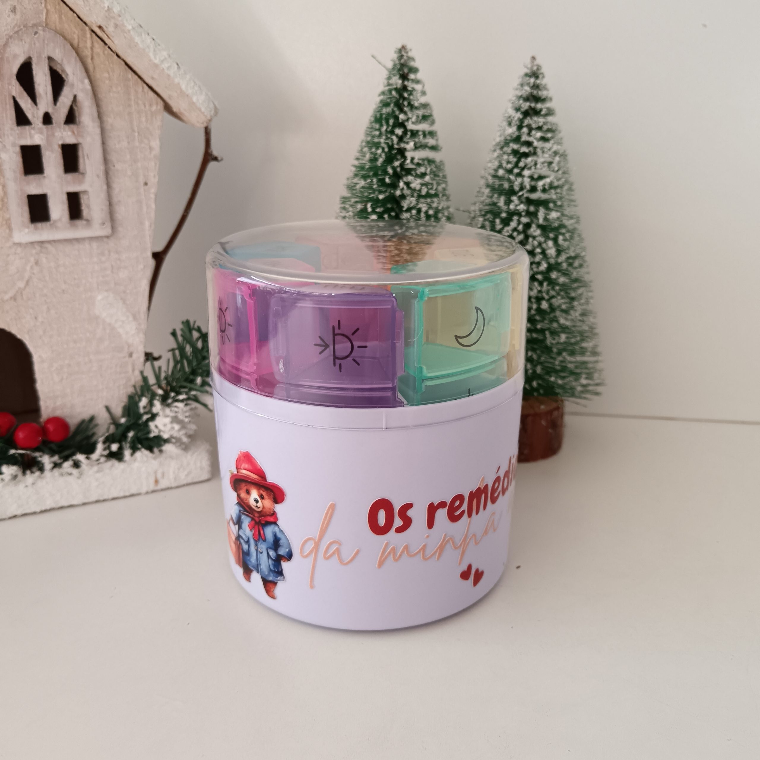 Caixa em forma de cilindro com 7 compartimentos divididos por cores para identificar rapidamente o dia da semana.
