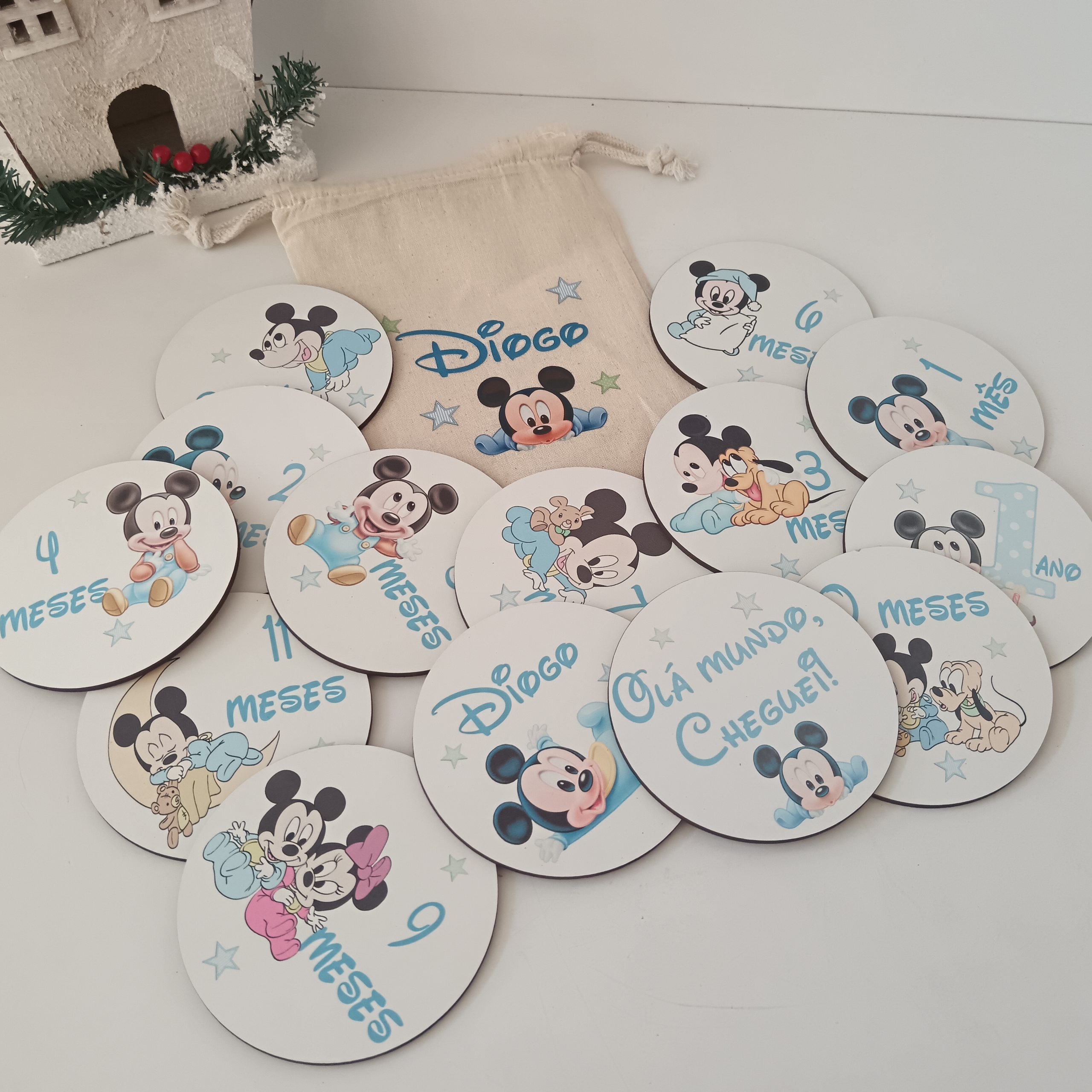Conjunto de 14 rodelas Milestones, utilizadas para assinalar momentos/meses em fotografias.