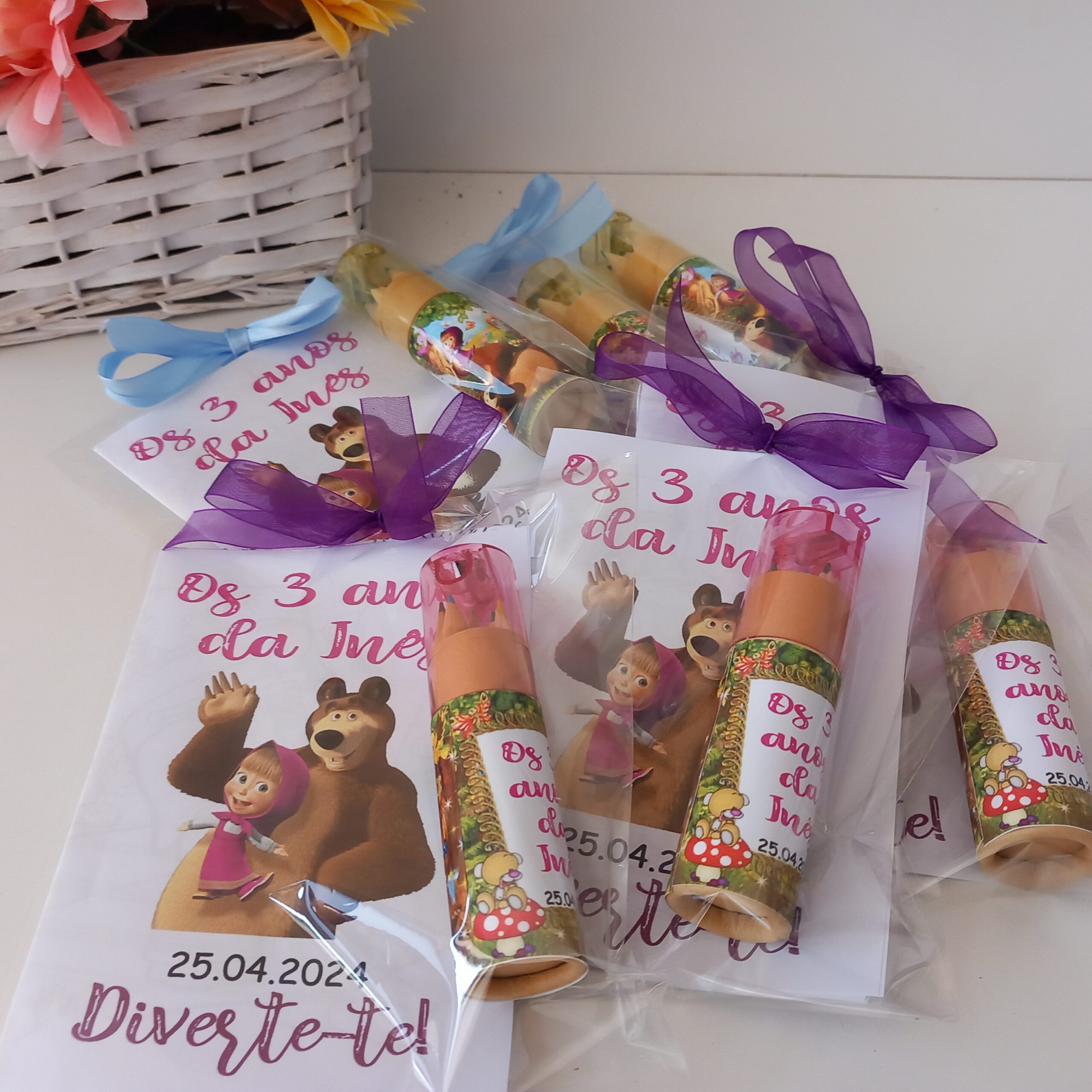 Conjunto de pintar, tema Masha e Urso, composto por desenhos e tubo de 6 lápis de cor