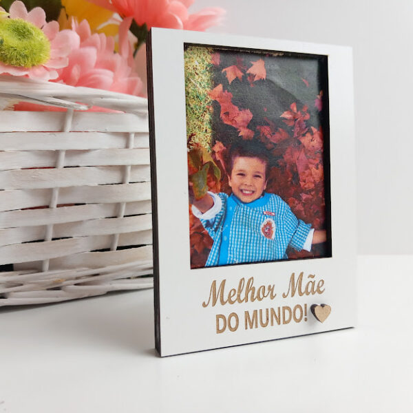É possível colocar palavra saliente (como na imagem), e/ou gravação a laser, na parte superior da foto.