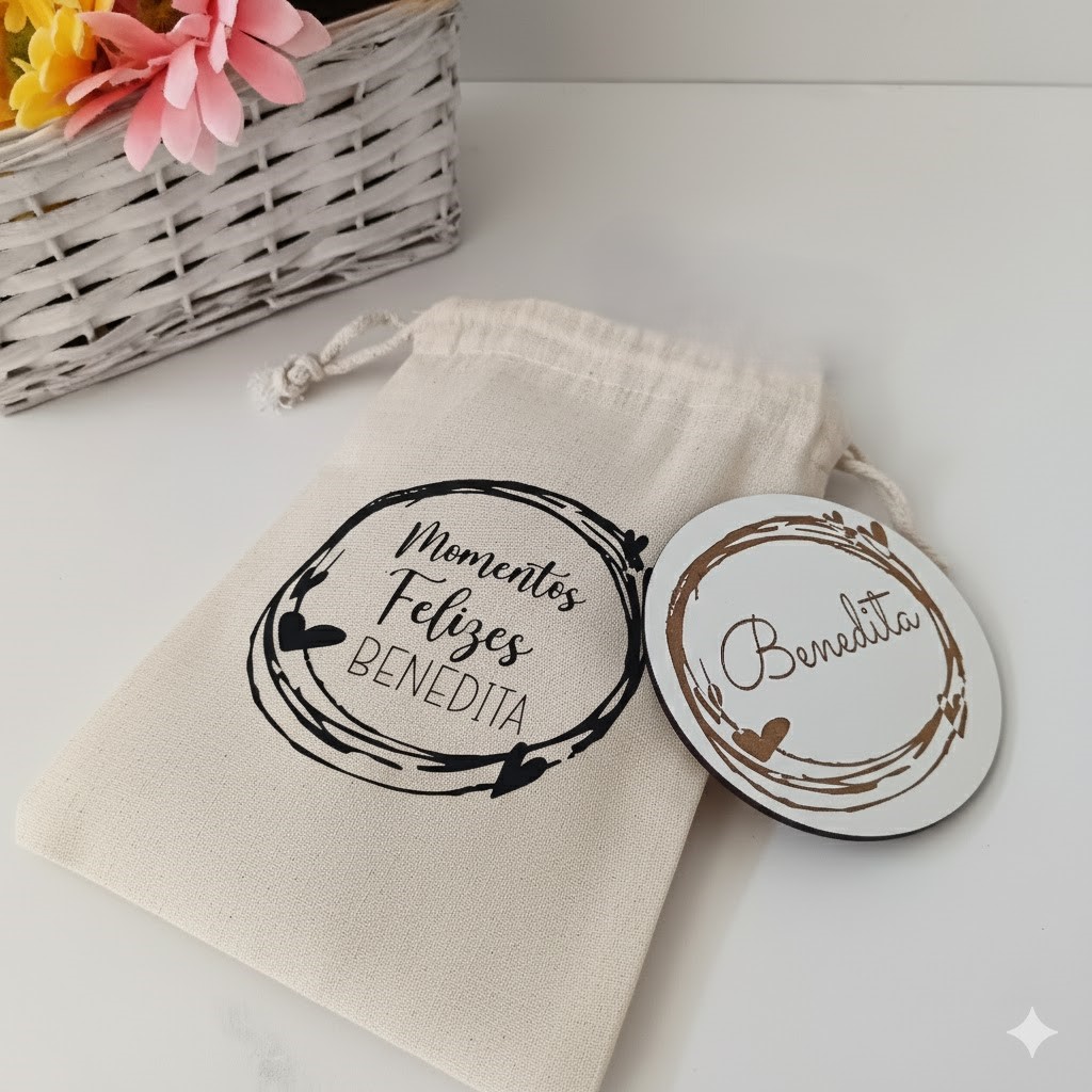 Saquinho Momentos felizes, personalizado com nome e rodela em mdf, com nome da criança