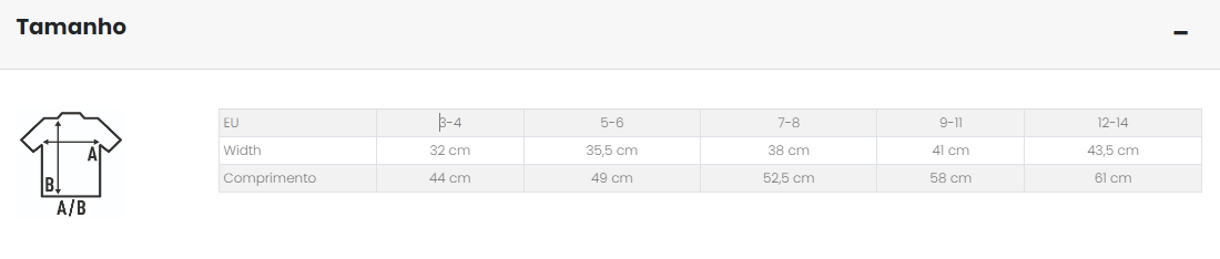Tamanhos 1 ano, 2 anos, 3-4 anos, 5-6 anos, 7-8 anos, 9-11 anos, 12-14 anos