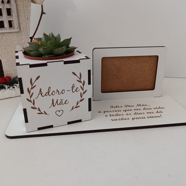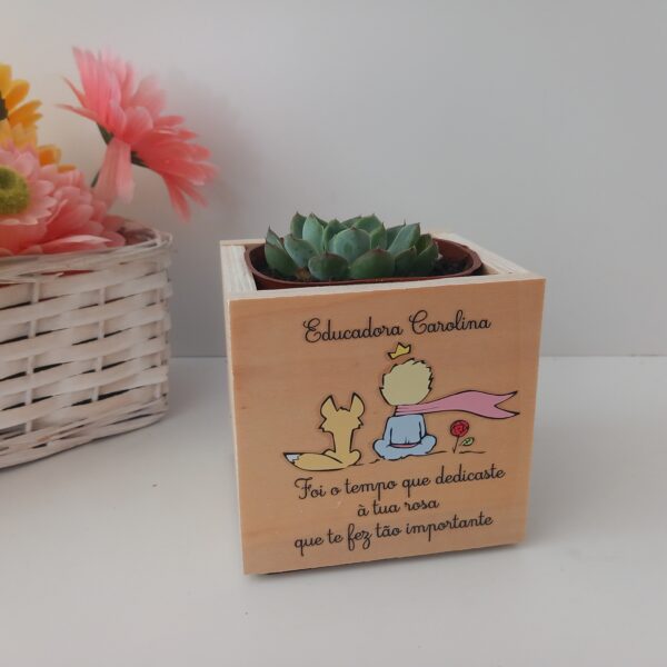 Para regar a Suculenta é aconselhável retirar o vaso plástico de forma a não molhar exageradamente a madeira.